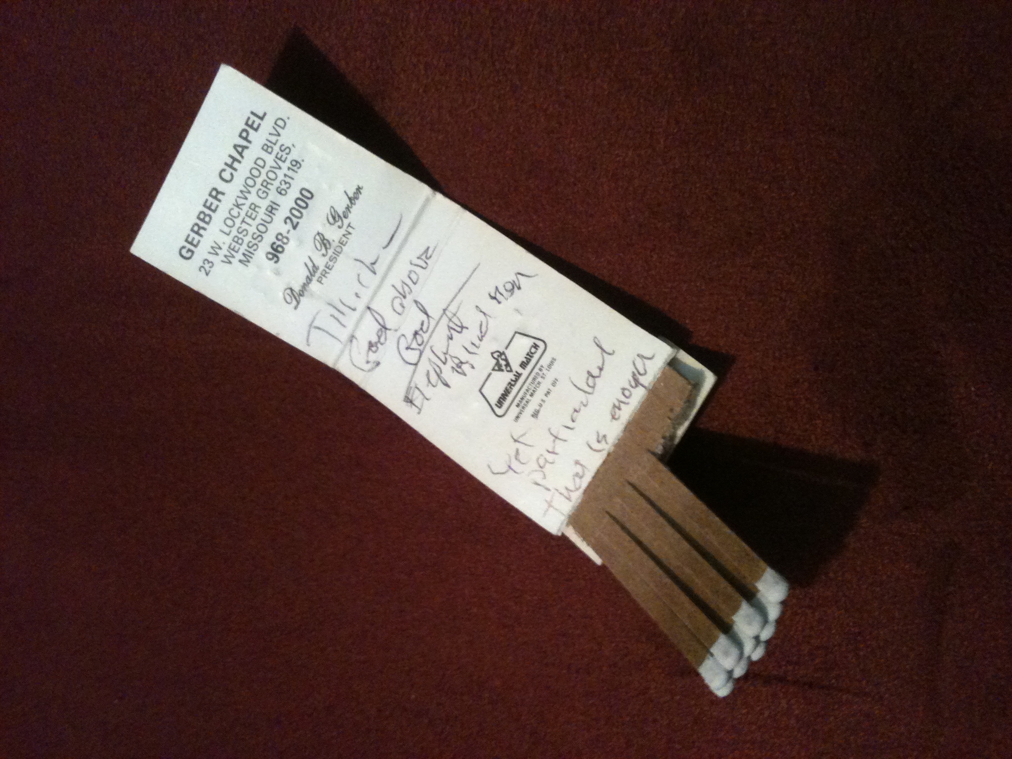 This day I fished around and reeled in a funeral home matchbook: Gerber Chapel from Webster Groves. Only a preacher would have a more than average quantity of matchbooks from funeral homes. It was a sign of the times, that a funeral home would provide matches for smoking customers, or customers to be. For me the dating was broad – somewhere between 1991 and 2006, a fifteen year interval. Close enough.